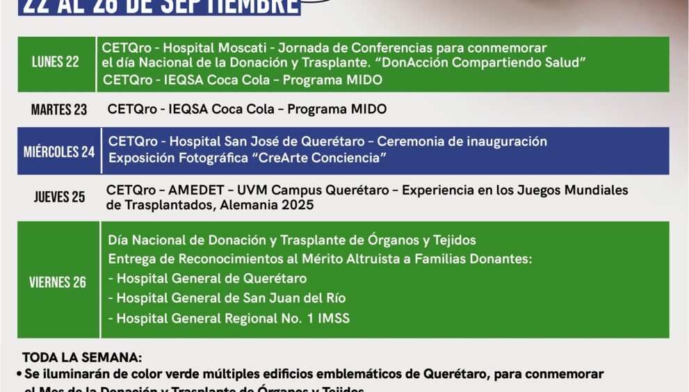 La Secretaría de Salud de Querétaro (SESA), a través del Centro Estatal de Trasplantes, convoca a la ciudadanía a participar en la XXIII Semana Estatal de Donación y Trasplante, que se llevará a cabo del 22 al 26 de septiembre, con el objetivo de reforzar la cultura de la donación de órganos y tejidos en la entidad.