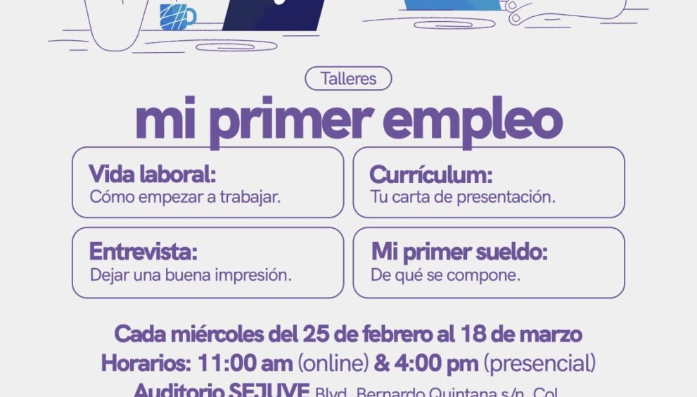 La idea es dar herramientas prácticas para enfrentar los primeros retos profesionales. Serán cinco talleres que se impartirán todos los miércoles, del 25 de febrero al 18 de marzo, con opción presencial y virtual. Las sesiones en línea se realizarán a las 11:00 horas, mientras que las presenciales serán a las 16:00 horas en el edificio SEJUVE.